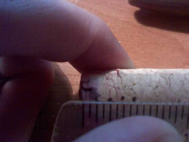 En el corcho, marcar 3 o 4 secciones que son 1/8 de una pulgada o unos 3 mm de largo. Cuando usted corta estos, como incluso ser posible! Si la pieza de madera es irregular, tenemos que equilibrarlo con los pedazos de corcho ligeramente más largo y más corto.