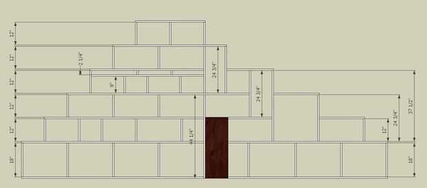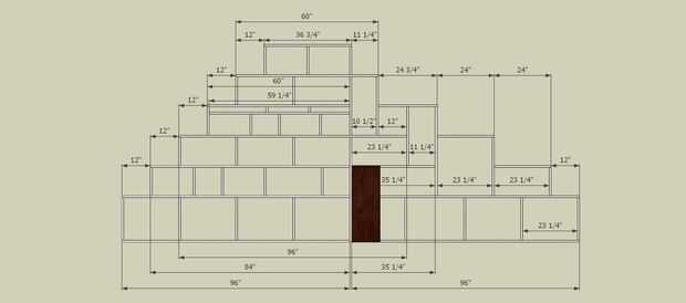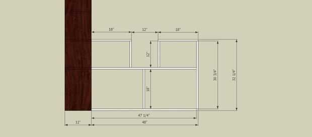 He optado por un diseño un poco inusual en forma de montaña. La izquierda es un conjunto de estanterías directamente en la disminución de longitud con uno de los estantes más cortos en altura para recibir DVDs. El lado derecho es un conjunto de varios compartimentos tamaños para libros, cosas altas u otros tales baratijas. Cada estante es de 12" de alto excepto el nivel de fondo que es 18" de alto. La sección T sobresale 4' de la plataforma y 2½' alta y ayuda a dividir la habitación en sala de estar y un área de estudio. El diseño SketchUp muestra como las juntas sentarse y se arreglan.