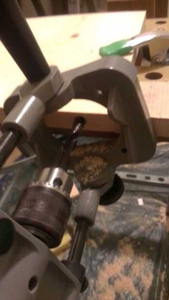 Compré una guía de perforación con descuento para $11 para ayudarme a taladrar los agujeros para los tacos como cerca de 90 ° en los extremos de los tableros. También me proporcionó paradas para profundidad de la perforación. Mayoría de los agujeros son 1" en el borde del tablero. Piezas verticales tienen el agujero en la veta 1 3/8" de profundidad, horizontal son 5/8" de profundidad. La Junta de la abrazadera hacia abajo y fije dos pedazos de chatarra en cualquier lado para proporcionar más superficie para la guía de taladro para reclinarse sobre. Si usted tiene centros de la clavija adecuada, taladro 3/8" agujero en el grano del extremo de las piezas verticales primero y les ofrecen hasta las piezas horizontales con los centros de taladro en el lugar para marcar donde estarán los agujeros correspondientes.