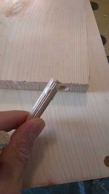 Con los agujeros perforados, soltar los tacos con un poco de pegamento para madera en los agujeros de grano de extremo (es decir, los tacos están en consonancia con las tablas). Esto facilita la librería a deconstruir en piezas planas, fácilmente transportables.
