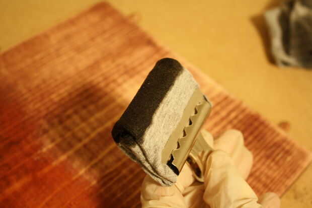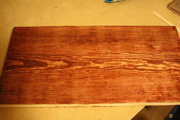 Había detallado mi método de tinción en otro Instructable (introducción a la coloración de la madera) con instrucciones más detalladas. He utilizado Minwax Bombay caoba mancha y poli en uno con un pedazo doblado de algodón de camiseta con el grano. La primera capa se seque durante la noche y luego lija con papel de grano 80 y una lijadora eléctrica para eliminar la mancha de los altos niveles de grano y hacer pop. Luego apliqué otra capa de caoba Bombay mezclado con manchas Minwax ébano en una caoba de 5 piezas a 1 parte de ébano se oscurezca la mancha. Esto se aplica a los tableros para dar más profundidad al color y dar un aspecto más envejecido a la madera.