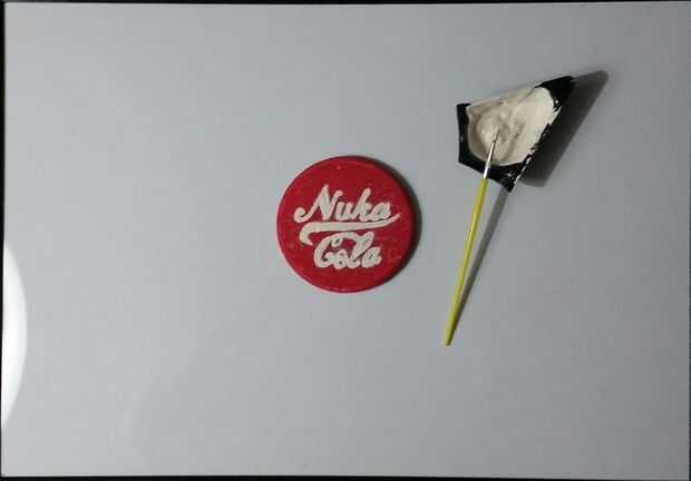 El siguiente y último paso es pintar el logo de Nuka Cola en la montaña roja seca usando la pintura blanca / mezcla del polvo del resplandor. Debido a la naturaleza de la mezcla puede requerir múltiples capas para conseguirlo mirando derecho.