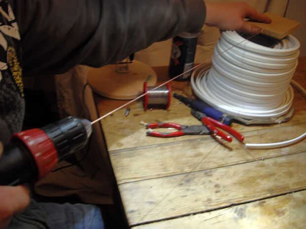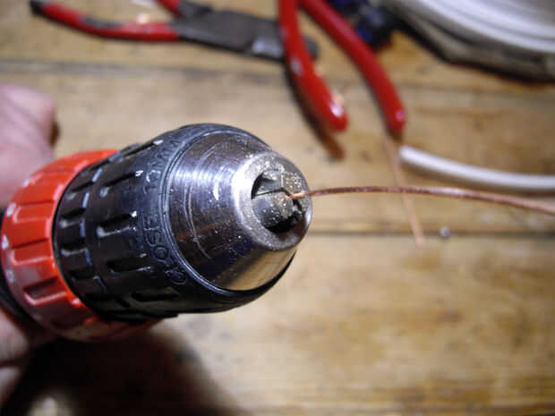El cable de tensión tirando de los dos extremos separados y girar el taladro lentamente. No enloquecer aquí - usted será capaz de ver cuando el cable tiene giros y ha enderezado hacia fuera.