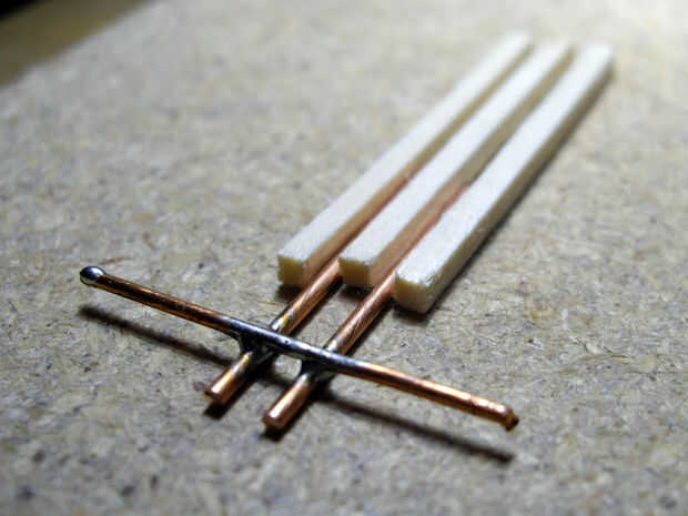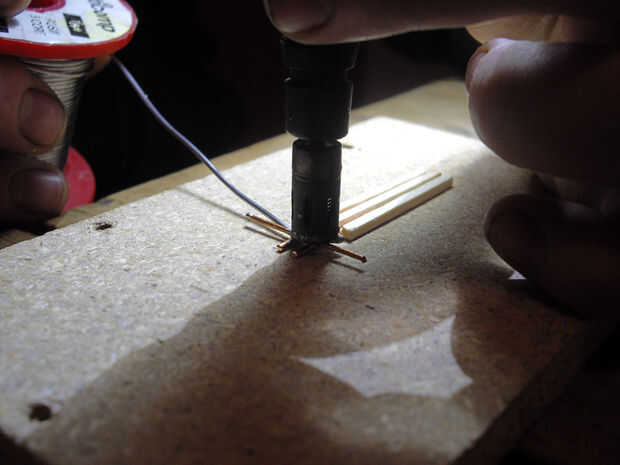 Coloque dos tramos rectos de alambre en la plantilla y corte algunos cortos durmientes que necesita la soldadura en las pistas.