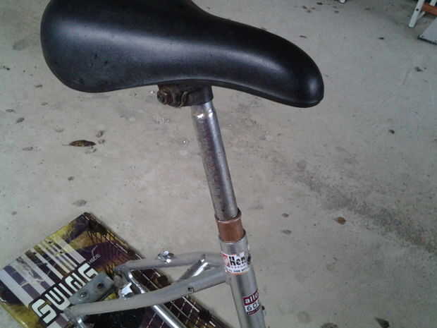 Entonces lo que hice fue conseguir un pedazo corto de tubería de cobre (puede ser ay tipo de pipa) luego lo martilló en el marco de la bici (debe ser el tamaño correcto) y luego martilló mi tija en él como no encajaría en su propia (la tija).