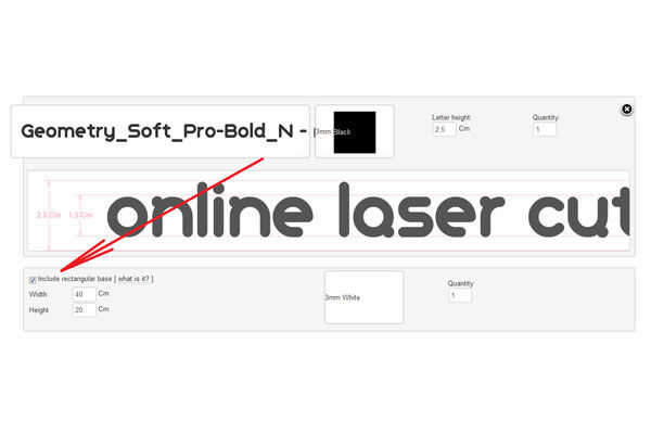Podría instalar su texto en una pared, vidrio, etc., pero voy a mostrar cómo instalar en una base rectangular de plástico. Para incluir este rectángulo en su orden tienes que comprobar la opción de "Incluir base rectangular" y asegúrese de que especificar el tamaño correcto!
