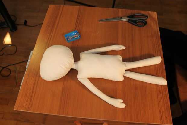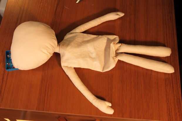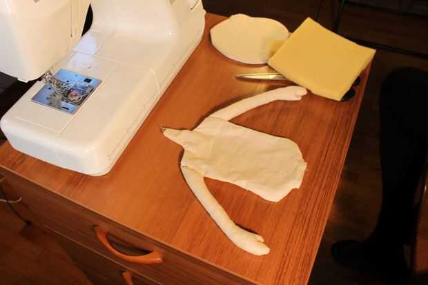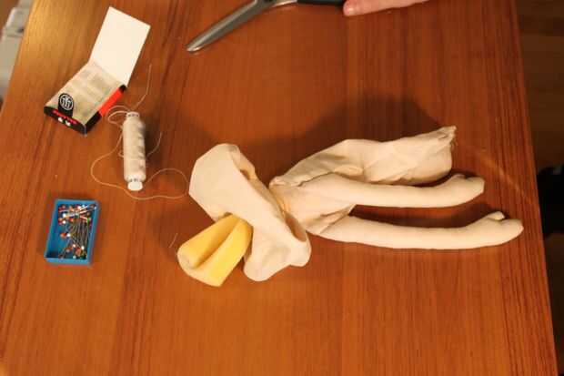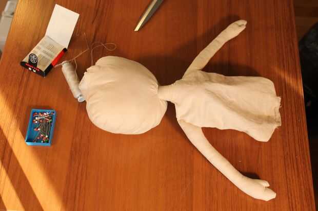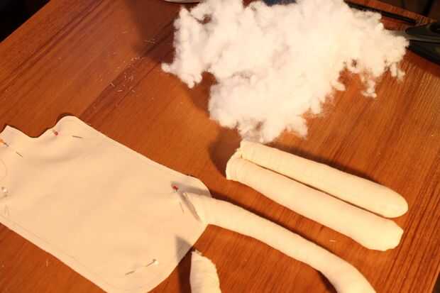 Fijar las patas al cuerpo con alfileres y coserlas, pero deja un orificio para