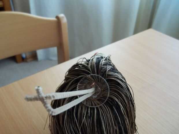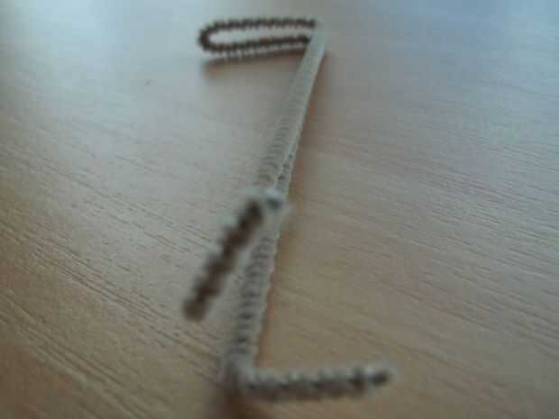 Doblar uno de los limpiapipas por la mitad. Medir desde la parte superior de la falda en la parte inferior. Desde donde usted puede no ver añadir 3 cm y corte el sobrante. Pliegan un cm en cada uno de los extremos. El limpiador de pipa es que sus pies. En la parte superior doble más 2 cm. Esta es la parte donde fijan las piernas a la borla. Pegamento caliente los pies en donde un nudo grande está por debajo del vestido. Quitó el lazo con el nudo para que se pegue dentro de la base donde hay un agujero largo y estrecho hasta la parte superior.