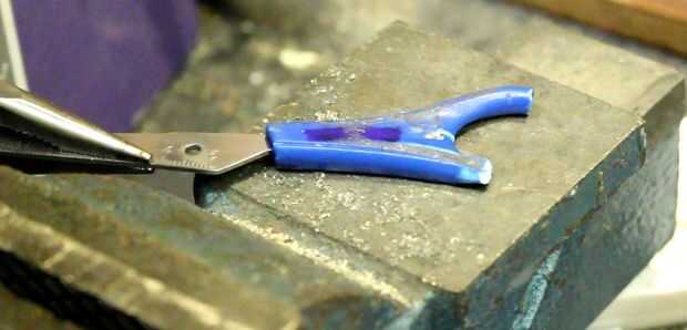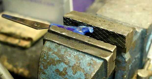 Después de el mango debe extraerse el metal. Más tijeras para esto se hace de un plástico termoplásticos como PET Polietileno de alta densidad y una forma posible de quitar la hoja sería calentar con un soplete pero no fui por este camino ya se pueden liberar vapores tóxicos del plástico desconocido o plásticos recalentados y tiene la posibilidad de sobrecalentamiento de la lámina y de ablandamiento lo (y la razón para usar una hoja de tijera es que es difícil ya!) En lugar de esto he decidido utilizar el método de fuerza bruta, usando una combinación de martilleo, machacar y cortar para quitar el plástico. Una vez quitado puedo ver la forma completa del acero por lo que puedo maximizar la longitud de la hoja.