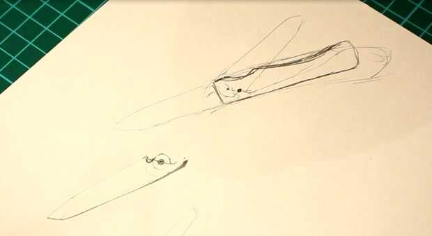Mi proceso de diseño es bastante crudo y consiste simplemente en un papel y lápiz. He trazado la forma de la hoja de tijera existentes y entonces decidió que quitar para convertirla en un cuchillo. Después de que una forma de mango se puede hacer, simplemente usé un cuchillo plegable existente que ya tenía y redujo un poco el mango. El mecanismo consta de 2 pines. El primero es el pivote de la cuchilla y que va a pasar por el agujero que ya está en la hoja el remache para ahorrarme tener que taladrar los agujeros. El pin 2 es el pasador de tope que limita la rotación de la hoja a unos 180 grados por lo que puede abrir y cerrar pero no doblar demasiado en cualquier dirección.