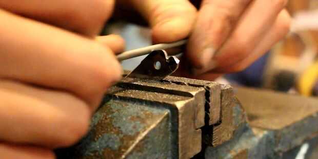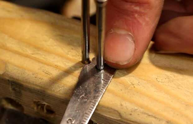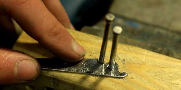 Hay literalmente miles de maneras de dar forma a una lámina de cuchillo que van desde un rock áspero a máquinas CNC de 5 ejes. No recomendaría demasiados pesadas Herramientas abrasivas que calentar la hoja y la dureza de la ruina. Utilicé una combinación de una lijadora de banda y amoladora angular y algunos pequeños archivos de la forma exacta de la hoja. Cualquiera de estas herramientas habría sido bien para la formación completa de la hoja. Para comprobar que el mecanismo de plegado es el tamaño correcto he martillado dos clavos en un trozo de madera de desecho como los pernos y probó la rotación de la hoja. Al principio no se convertiría lo suficiente para que sacar algo más de material que entra en contacto con los pernos y luego prueba otra vez hasta que fui feliz.
