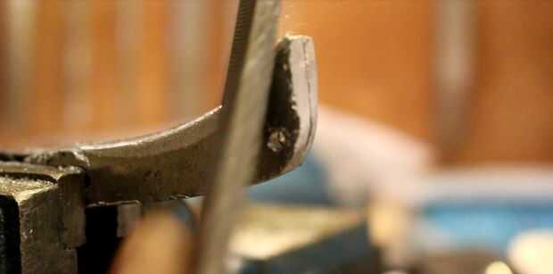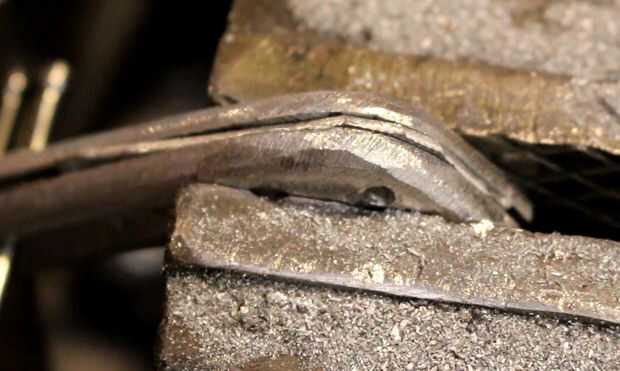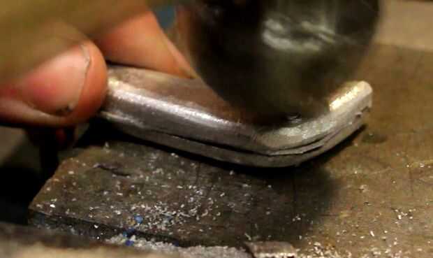 El pin que estoy usando es un clavo de acero 3mm. Algo más de lujo como latón se puede utilizar pero quería mantener esta estructura libre. El perno se inserta y cortar a la longitud, aproximadamente 1mm más largo que sea necesario. Entonces usando el yunque en la parte posterior de mi mordaza de mesa y un martillo bola 32 oz que doblé sobre los bordes del perno, expandiéndolo y aplastamiento de las capas de mi mango junto.