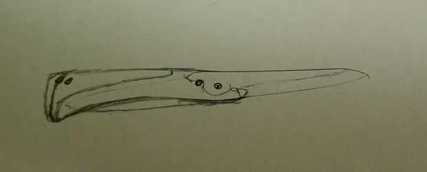 El mango trabaja como un sándwich de aluminio. Dos hojas más gruesas adjuntar la hoja del cuchillo y tienen un espaciador fino del mismo espesor que la hoja en la parte posterior para que el cuchillo puedo girar.