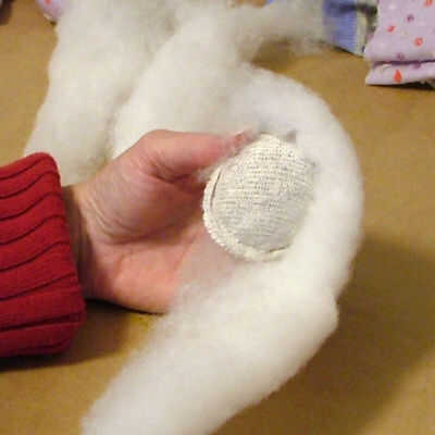 Tomo algunos bateo edredón y enróllelo alrededor de la bolsa de frijol antes de insertar en la cavidad del cuerpo. Trabajo el relleno y el bolso alrededor en el calcetín para que el bolso de haba encaja perfectamente en el talón del calcetín, formando a un agradable "tope" para que Bobb para sentarse.