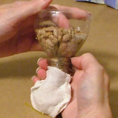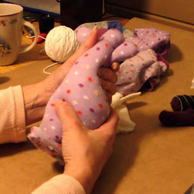 Utilizo dos tipos de relleno, pero no tienes que ir a ese problema. Usar peluche, relleno para el 'nobbies' superior y la parte superior de su cabeza. He encontrado que los compañeros poco mejor sentarse si ligeramente se cargan, así que tome un viejo calcetín gastado, pero limpio y hacer un poco "Puff" fuera de él. Aquí puedes ver mi embudo de vuelva a encender hasta que uso para meter los granos en la bolsa. Después de todo, simplemente coser cerrado. Es más fácil trabajar con frijoles embolsados que llenar el calcetín directamente con frijoles, además esto impide que la neurona está grumosa. Pero abultado podría ser un "look", también.
