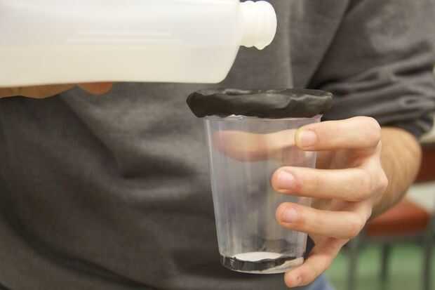 Ahora, sumerja el fieltro con el alcohol de frotamiento y coloque la taza boca abajo sobre la superficie del metal que contiene el hielo seco.
