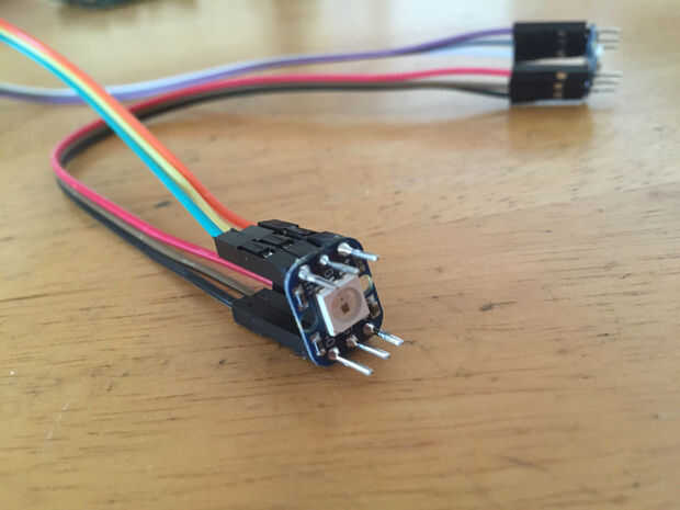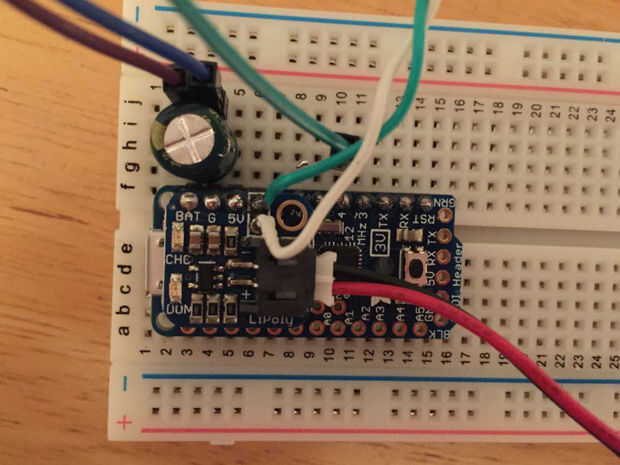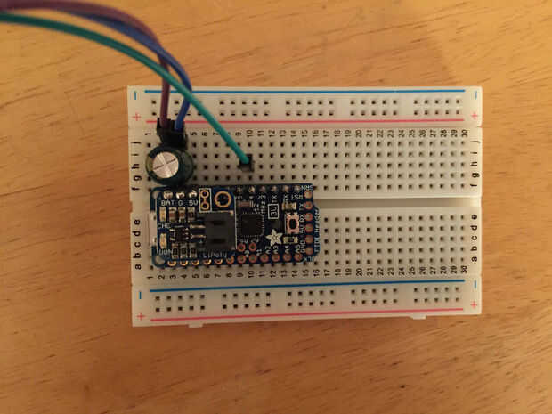 tomar la ruta más fácil de soldar cables de puente macho directamente a la Neopixels. Los cables son flexibles, las conexiones son sólidas, y es super rápido y fácil. No hay necesidad de pelar los cables! Prueba sus conexiones como vas, por lo que rápidamente puede arreglar cualquier problema. El circuito básico de este proyecto es muy simple. Estoy construyendo minas en un protoboard por ahora, pero para un proyecto permanente, que probablemente desee soldar cosas entre sí directamente, o tal vez usar un poco proto board. Con sólo 5 LED, usted probablemente no necesita un condensador, pero siempre lanzo uno todos modos seguro. Es importante la polaridad de un capacitor. Significa que tendrás que conectarlo correctamente para que funcione. Hay varias maneras de reconocer la polaridad de su condensador.
