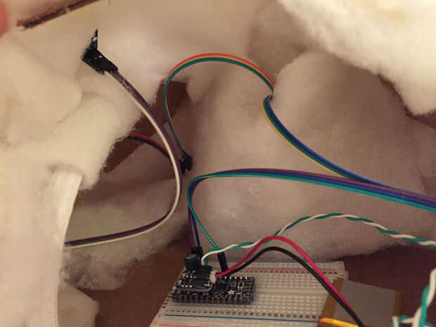 Usted puede tratar de diferentes colocaciones de los LEDs dentro de la nube. Terminé añadiendo algunos pedazos de cartón en el interior, porque quería algunas partes de la nube para ser un poco más oscuro que en otras partes. También la animación juega un rato a la izquierda y pegado unos cottonballs más siempre que se sentía bien.