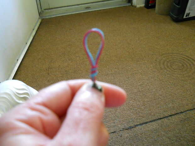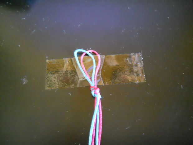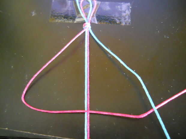 Paso #1: ahora que tienes los suministros que usted necesita, en mi instructable utilizaré rosa y azul del trenzado del cordón. Toma los dos cables / cadenas que usted eligió, doblar por la mitad y atar un nudo, que usted ahora tiene un bucle. Ahora tome el lazo y la cinta o el clip a una superficie plana, como un tablero de clip, mostrador, escritorio, o cualquier tipo de estación de trabajo tiene y separar las cuerdas, en cuatro secciones, con los más largos en el exterior y los más cortos en el medio. En mi instructable será la rosa a la izquierda y azul a la derecha.