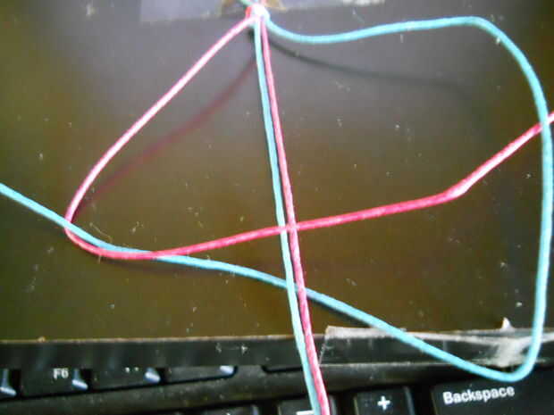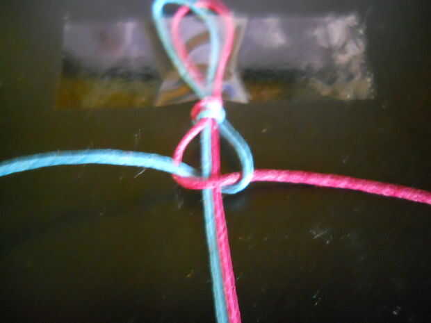 Paso # 3: ahora tome la derecha de la cuerda, que si empezaste a la derecha, sería la cuerda izquierda y Cruz detrás de los dos cables de media y hacia arriba a través del lazo, y ahora tiene la primera mitad del nudo.