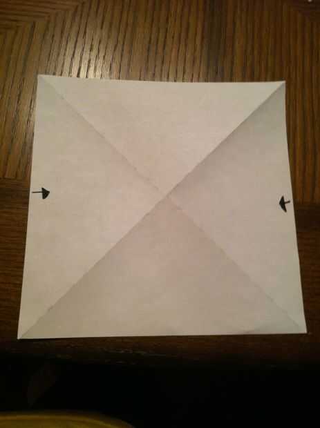 Dé vuelta el papel y presione lados juntos entre triángulos en los lados opuestos así que el papel comienza a "colapsar".