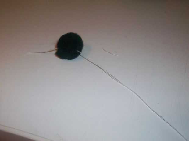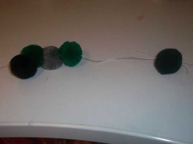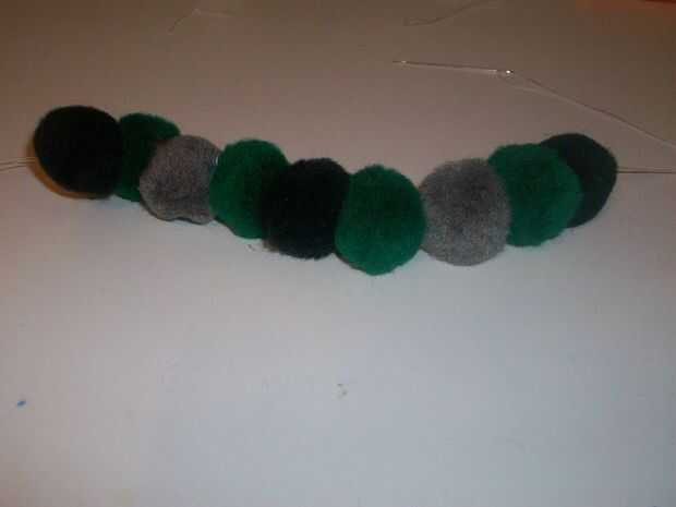 (1) el primer pompón en el hilo de la secuencia, se trata de la cabeza. (2) seguir añadiendo pompones. (3) acabado tendido!