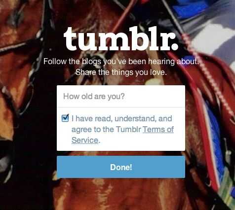 Ingrese su edad y haga clic en la casilla de "He leído, entiende y acepta los términos de Tumblr de servicio." Haga clic en el recuadro "Hecho!" .
