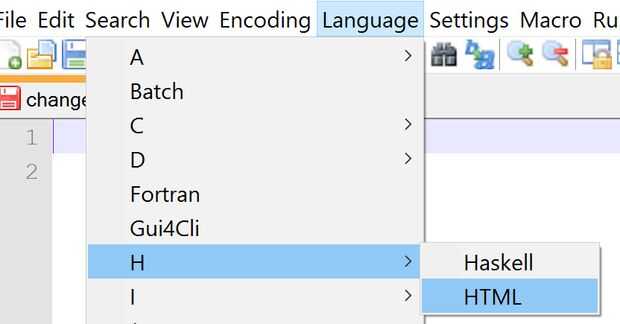 Primero empezaremos con el lanzamiento de su editor de HTML . Si usted está usando Notepad ++, se sugiere que usted haga clic en la pestaña idioma y selecciona HTML. Esto hará que el código más fácil de leer.