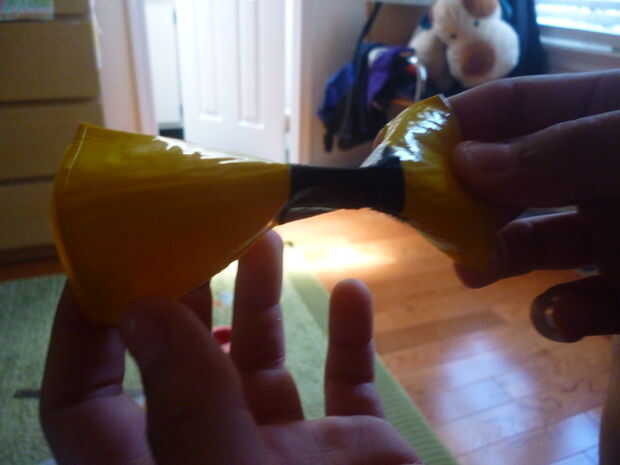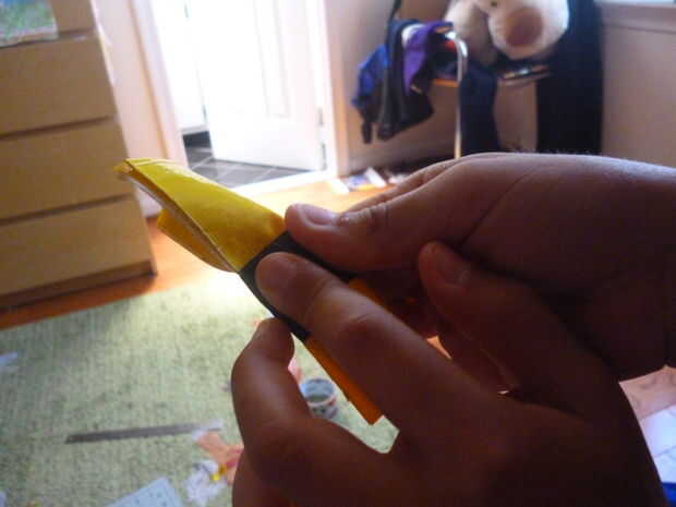 ahora tome corta un trozo de conducto de cinta de 2 1/2 pulgadas de largo de su segundo color. cortar por la mitad verticalmente. ahora abrazarte tanto de las hojas que usted acaba de hacer juntos, y cuidadosamente coge una tira de cinta que usted a recogido y envuélvalo alrededor de la mitad horizontal de ambos de las hojas.