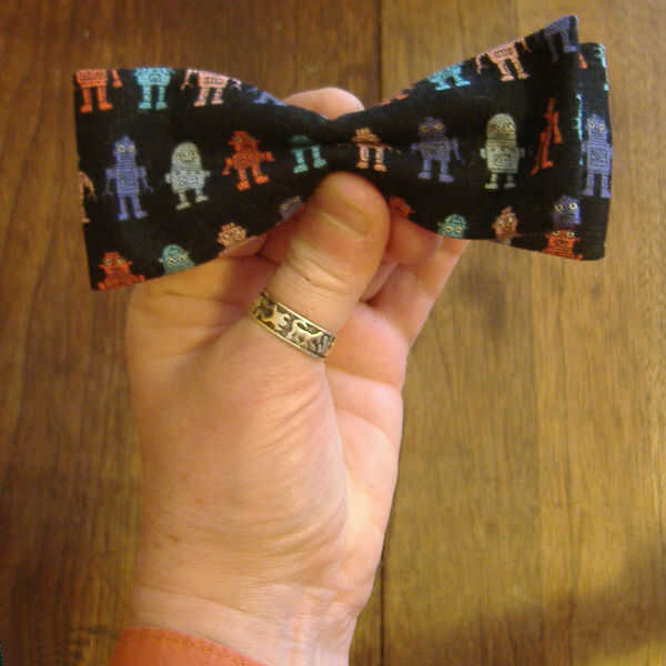 Apilar las dos hojas del arco (comprobar con cuidado otra vez para una orientación frontal y posterior y superior e inferior), con el clip, colocación junto, comprobación de los motivos de diseño de tela visible. Enrolle la banda del centro (también comprobar colocación de diseño), doblando los extremos cortados, en la parte posterior de la corbata de moño, alrededor de las hojas y el clip. La banda del centro del perno o pellizcar con los dedos. La banda debe constreñir fuertemente el paquete, que requieren puntadas firmes para reunir los extremos en la parte posterior de la corbata.