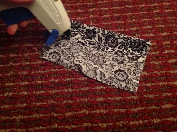 Colocar su material frontal y doble una sección para que algunos de la parte delantera está mostrando. Me gustaria poner alrededor de la mitad. Ahora toma tu pistola de pegamento y cualquier punto o difunda constantemente en el borde de la borde. Ahora, levante el otro lado y presione suavemente sobre la parte encolada. ¿Ver la línea donde el material se pega?