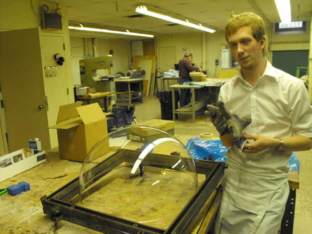Una vez que la hoja está justo por encima de su punto de fusión (la superficie empieza a curva), ponlo en el bote de basura. Iniciar el vacío y espere hasta que la cúpula está formada. Hacer un ruller de forma de T para saber el radio de la cúpula mientras se forma.