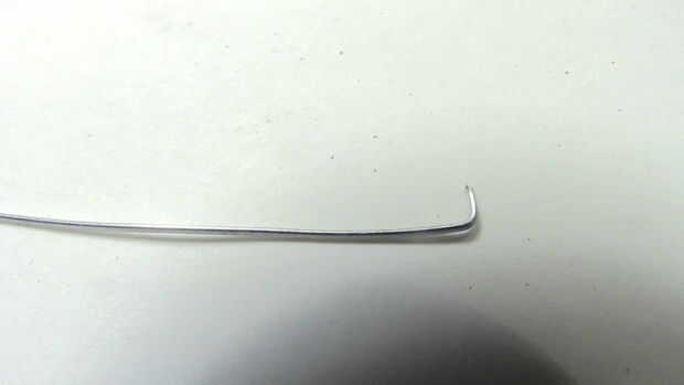 3. tomar un puente aislado de 4 a 8 pulgadas. Usando alicates, haga pequeñas de 90 grados de ángulo en la punta. La clave para esto es para asegurarse de que la parte curva no es más grande que el grosor de su pert, o bien sobresaldrán el otro extremo, y no quieren ver eso.