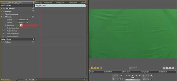 En la ventana 'Efecto controles' bajo efectos de vídeo por que ahora debería haber una baja clave ultra abrirlo y utilizar el cuentagotas en la pantalla verde. Si no sabes lo que es la herramienta de cuentagotas se refieren a la imagen de arriba.
