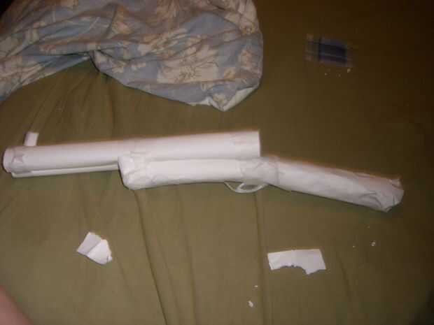 ahora que tienes la estructura básica, agregar una vista, un gatillo y cubre los 4 tubos pequeños. Voila! vaya diversión! pero para hacer cualquier cosa con él, necesitas balas. balas se hacen fácilmente para arriba papel en conos puntiagudos y grabarlo. para disparar, deslice los tubos del cañón y luego cargar la bala. y luego soplar en el tubo. pasar un buen rato