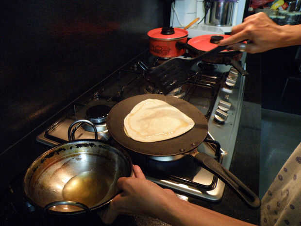 De calor un tawa o sartén y colocar la masa aplanada en él y repartidas unas gotas de aceite.