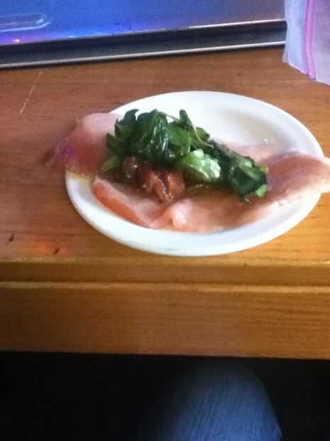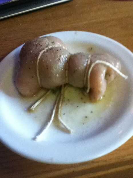 Meta en los dos extremos cortos hacia el centro. Usando la cadena como un poco de ayuda, rollo largo termina juntos de modo que se tocan y que se superponen; Ate su cuerda niiice y apretado alrededor de ellos. Tirón de modo que el lado "suelto" en la parte inferior y la cara "plana" con un poco de sal y pimienta de la temporada.