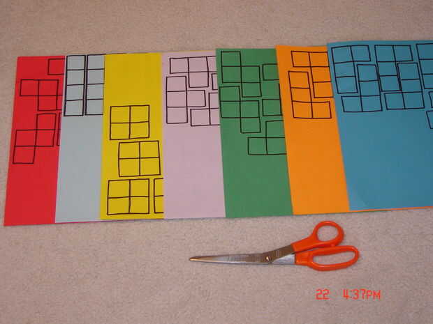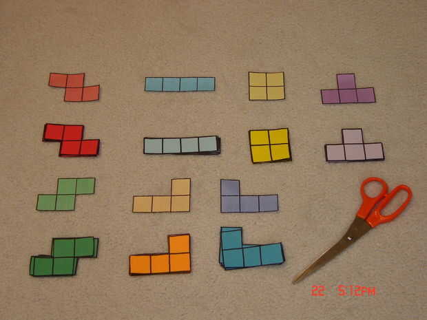 -Con tijeras o un cuchillo X-acto con cuidado recorta los tetrominós -NO CORTAR LAS CAJAS POR SEPARADO!!!! CORTAR EL CONTORNO! (Cada Tetrominoe debe tener 4 cajas dentro)