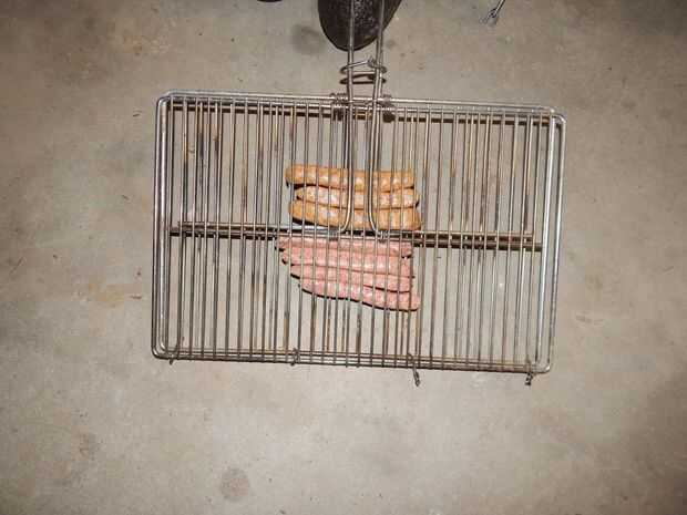 Dar a la parrilla un cepillo hasta quitar hollín o polvo y abrirlo. Disponer las salchichas en un lado, cerrar el otro lado sobre ellos y asegurar las asas entre sí.