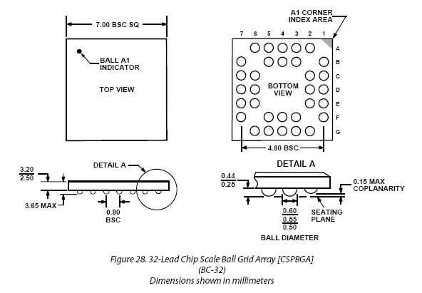 Como ya he mencionado que existen tres aspectos a una parte en águila. Vamos a empezar con el paquete. Queremos hacer un 32 conducir BGA (Ball Grid Array). De la hoja de datos podemos ver que las bolas son de 0.55 m m de diámetro y espaciados a 0.80 m m en centro appart. Los bordes lejanos son appart 4,80 mm en el centro.