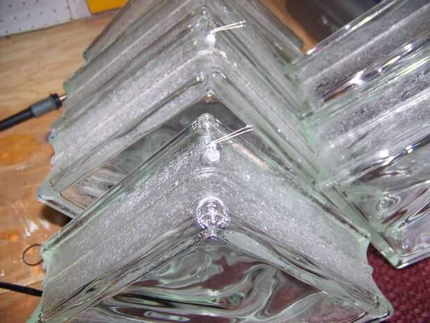 En la esquina de cada uno de sus bloques, montar un LED de tu color elegido, virar en su lugar con pegamento caliente, luego cubrir todo el asunto en epoxi o silicona. Asegúrese de que dejar los cables expuestos.