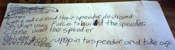 Para este estilo de stop motion, la trama debe incluir algún motivo para la construcción de un conjunto de Lego. Mis hijos aman Lego Star Wars, y la fuerza proporciona una excusa útil en cuanto a por qué algo es mágicamente construyendo. Pedir la kid(s) a escribir unas líneas que describen lo que sucederá en la película. Mantenerlo simple! Lo anterior es un script de ejemplo.