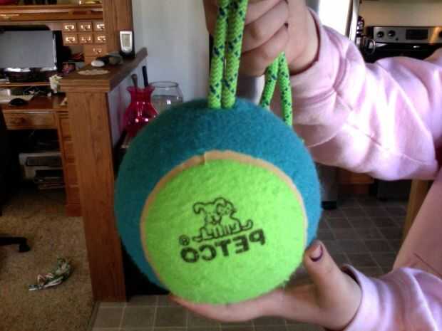 Ahora, corte un agujero en la parte superior de su pelota de tenis, lo suficientemente grande que puede caber el nudo en el extremo de la cuerda, pero asegúrese de que su caballo no puede tirar fuera del agujero.