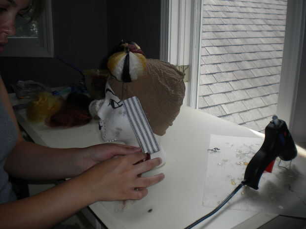 Tome un tapón largo y aplicar un punto de pegamento caliente como hiciste las orejas. Colocar el tapón en la parte inferior de las patillas, justo en el borde más cercano a la cara. Trabajar su camino hasta la patilla hasta la oreja. Asegúrese de colocar un tapón hasta cerca de los oídos. Lagunas que una peluca se vean mal.