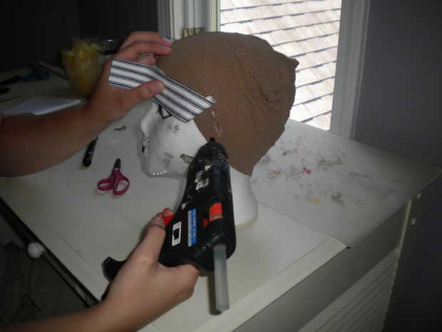 Cuando la pistola de pegamento caliente, coloque una línea de pegamento a través de un estrecho borde de la patilla. Presione con cuidado el extremo en el casquillo de la peluca, acerca de dónde estaría su templo. Ángulo hacia la parte posterior de la cabeza. Después de que sobre todo se enfría, levantar las patillas hasta el lugar una línea vertical de pegamento en el casquillo de la peluca, a lo largo del borde de la patilla. Presione con cuidado la patilla en su lugar.