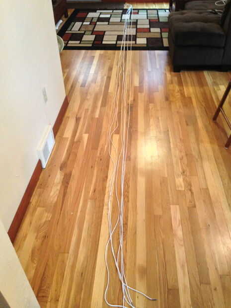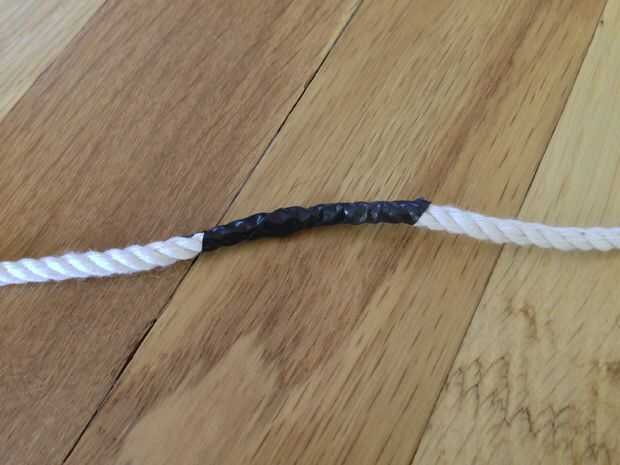 Necesitaremos 6 filamentos de 20 pies. Pongo todos 120 pies, 20 pies a la vez, ir hacia adelante y hacia atrás 6 veces. Entonces puse un par de pulgadas de la cinta en las longitudes de 20 pies y cortar la cuerda en medio de la cinta.