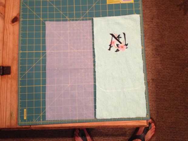 Usando un dentar tijeras y tela prelavada, cortar un trozo de tela de toalla o había acolchado tela 14 x 7 pulgadas. Utilicé tela de toalla y había bordado de un diseño en el frente. Si bordan en tela de pelo como el paño de terry, asegúrese de utilizar un adorno de soluble en agua para que tus puntadas son accesibles. He utilizado Floriani agua soluble de cumpleaños. Corte una pieza de popelina de algodón, tela de la guarnición del mismo tamaño. Cortar un trozo de toalla de plato saco de muselina o harina 13 x 6 pulgadas para la cereza bolsa piedra interior.