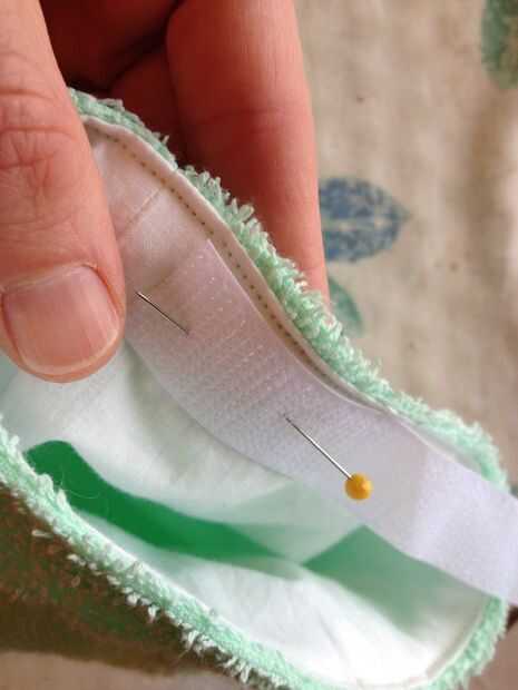 Corte una pulgada de 5 1/2 pieza de 3/4 pulgada ancho Velcro. Perno de cada lado del Velcro al borde superior, interior de la bolsa justo debajo de la parte superior y coser los 4 lados de la cinta de Velcro. He cosido en el interior y mantiene el hilo de color en la bobina entonces mi puntadas eran invisibles en la tela principal.