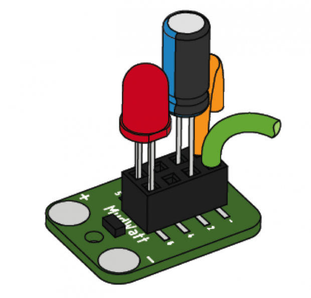 Condensador: el condensador es un componente pequeño de almacenamiento de energía. Es capaz de acumular energía como energía proviene el MudWatt y luego descarga esa energía en una explosión rápida a parpadear el LED.