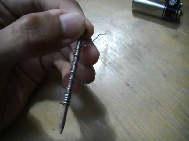 Tomar aproximadamente 12 pulgadas de alambre de platino y cortar en dos trozos iguales de 6 pulgadas. Tome el extremo de cada cable y gire sobre el clavo, para que se vea como un resorte. Sin embargo, dejar libre aproximadamente 1 pulgada del extremo. Estos actuarán como sus electrodos.